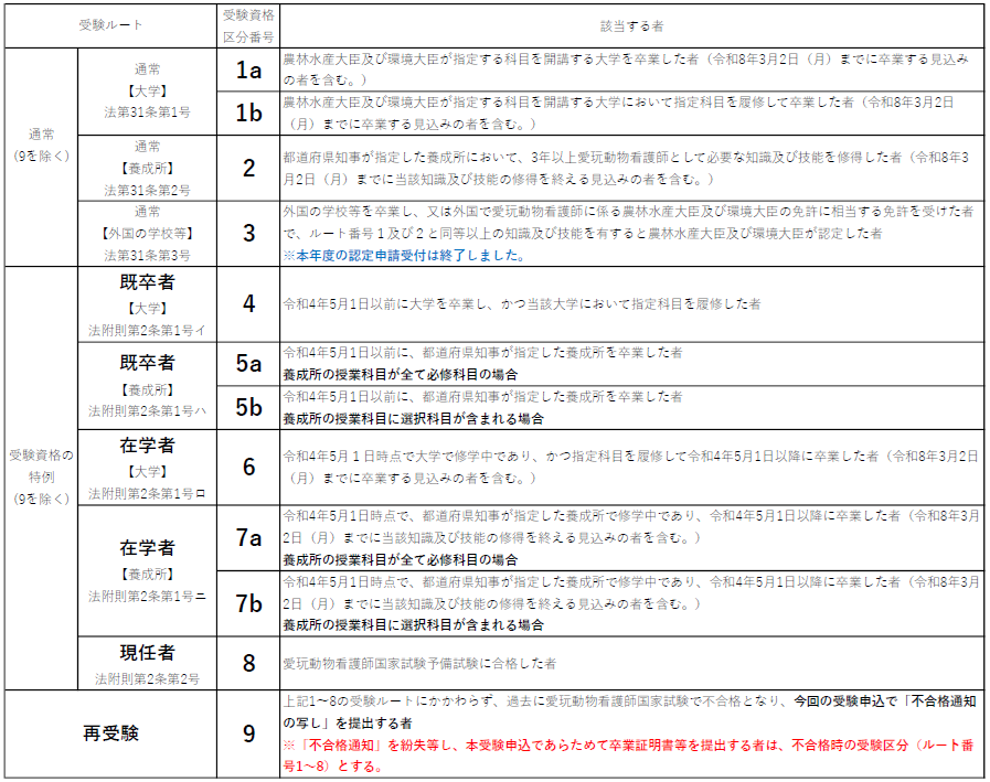 ※なお、上記受験資格にかかわらず過去の愛玩動物看護師国家試験を受験し、不合格となった者は、「再受験」の受験ルートを選択することができる。この場合、提出する必要書類が異なるので留意すること。